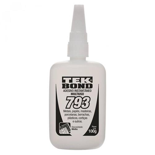 Colas Adesiva Instantânea Tek Bond 793 100gAplicação:Adere diversos tipos de materiais, como compostos de borracha, EPDM, borracha nitrílica, neoprene, EVA e Viton. É um adesivo multiuso, muito utilizado no setor moveleiro, setor industrial principalmente em artesanato de chinelos, caixas de MDF e muito mais.Características:É um produto monocomponente e não requer mistura. O processo de cura inicia-se quando uma fina camada de adesivo é aplicada entre as superfícies entrando em contato com a umidade do ar atmosférico.Modo de Uso:Para obter um resultado satisfatório, as superfícies devem estar limpas, isentas de óleo e sujeira. Deve-se aplicar uma camada fina de adesivo em apenas 1 um dos substratos a serem colados, pois o excesso prejudica o bom desempenho da colagem.Após a aplicação do adesivo, é preciso manter as peças pressionadas por aproximadamente 20 segundos, quando a cura inicial estará concluída e a peça poderá ser manuseada com segurança. A cura total ocorrerá em 24 horas.Este adesivo é indicado para folgas de até 0,10mm.Precauções:O excesso de cola prejudica a colagem. Cola a pele e olhos em poucos segundos. Mantenha fora do alcance das crianças.Dados Técnicos:Viscosidade cP : 80 a 120 Média Temperatura de Trabalho ºC : -55 a 80Preenchimento de Folgas mm : Até 0,10Resistência ao Cisalhamento Aço x Aço : ? 100Kgf/cm2
