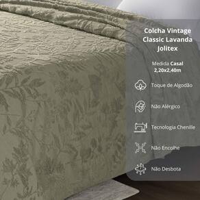 Descubra o prazer de vestir sua cama com a elegância e qualidade da coleção Vintage Classic da Jolitex. Com a tecnologia Chenille e uma paleta de cores sofisticada em bege, branco, cinza, marrom, verde e azul, cada peça traz um toque refinado para a sua decoração. Desenvolvida para ser prática e duradoura, não amassa, não encolhe e mantém sua beleza impecável, mesmo após muitas lavagens.
