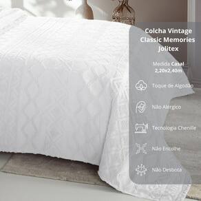 Descubra o prazer de vestir sua cama com a elegância e qualidade da coleção Vintage Classic da Jolitex. Com a tecnologia Chenille e uma paleta de cores sofisticada em bege, branco, cinza, marrom, verde e azul, cada peça traz um toque refinado para a sua decoração. Desenvolvida para ser prática e duradoura, não amassa, não encolhe e mantém sua beleza impecável, mesmo após muitas lavagens.