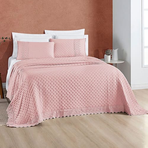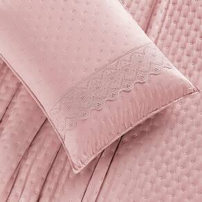 Matelassê em bolinhas: Confere um toque de sofisticação e elegância ao conjunto. 2 Porta tarvesseiros 70cm x 50cm com detelha em bordado ingles Acabamento em bordado ingles: Detalhe delicado que adiciona um toque romântico. Tecido macio: Proporciona toque suave e agradável. Fácil de cuidar: Lavável em máquina, conforme as instruções da etiqueta.