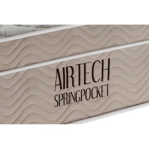 Colchão Airtech Spring Pocket Solteirão (108x198x30) - Estrutura em molas Superpocket, EPS, D26 Pró - Airtech SOBRE O PRODUTONovo Colchão Airtech Spring Pocket tem sua estrutura composta por Molas Superpocket ensacadas individualmente, que fazem o peso de um corpo não interferir no conforto do outro, proporcionando um perfeito suporte para a coluna e conforto para qualquer biótipo, possui Ortopillow e em sua camada de conforto espuma D26 Pró Aditivada de Alta Performance, bordado em matelassê e placa EPS. Seu tampo é em malha de alta qualidade e lateral em Camuça, apresentando um toque refinado ao colchão. Possui a tecnologia No Turn, que dispensa a necessidade de virar o colchão. O Airtech Spring Pocket recebe tratamento antialérgico e antiácaro, ajudando a reduzir os problemas respiratórios. Ideal para suas confortáveis noites de sono.CARACTERÍSTICASEstrutura em molas Superpocket (ensacadas individualmente), placa EPS, Ortopillow, tampo em malha, bordado em Matelassê, manta de espuma D26 Pró, faixa lateral em Camurça, No Turn (não precisa virar), tratamento antialérgico e antiácaro.