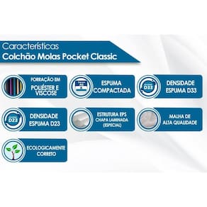 CARACTERÍSTICAS INTERNA DO COLCHÃO Tipo de Estrutura de Molas - Molas Pocket (Ensacadas) Camadas Interna do Estofamento de Espuma - Espuma Compactada Tipo de Estrutura Ortopédico - EPS Outras Características Internas - Polyframe Reforço nas bordas - Manta Acrílica