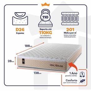 Feito com os mais nobres materiais em sua composição, ele conta com espuma D26. O colchão King House acomoda melhor o contorno do corpo, dispondo de forma correta quadris e ombros, expulsando as dores e problemas de coluna.
