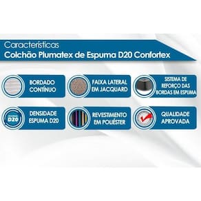 Imagens Meramente Ilustrativas. Não nos responsabilizamos pela montagem/instalação dos produtos. Todas as informações divulgadas são de responsabilidade exclusiva do fabricante/fornecedor. Forração Revestimento do Colchão: Malha Importada Nível de Firmeza do Colchão: Macio c/ Firmeza Nossa Avaliação do Colchão: Qualidade Boa Peso Máximo Suportado do Colchão: 50 kg Tempo de Garantia do Colchão: 12 meses Certificação de Qualidade do Colchão: Qualidade Aprovada Tecido de Revestimento da Faixa Lateral do Colchão: Decorativa Bordado do Revestimento do Colchão: Contínuo Tecido com Tratamento do Colchão: AntiÁcaro e AntiFungo Modo de Utilização do Colchão: Double Side Camadas Interna do Estofamento de Espuma do Colchão: Alta Qualidade Densidade da Espuma do Colchão: 20 É eco-friendly: Sim É antiácaros: Sim Com moldura perimetral: Não Com pegas laterais: Não de registro/certificação INMETRO: N/A Tipo de Produto: N/A É kit?: Não Condição do item: Fonte do produto: N/A Código universal de produto (GTIN): 7899076996132 Produto precisa de Montagem?: Sim, a montagem é simples mas sugerimos a contratação do nosso de montagem (para os CEPs em que o está disponível) ou de algum experiente de sua preferência Descrição do Tamanho: cm Estado de Origem: RJ País de origem: Peso Produto Com Embalagem (Kg): Material para Filtro: N/I Cor Mobly: N/I Condição do Item: Numeral: 0 Não se Aplica: N/A Não Possui: Não Linha/Modelo: Plumatex Cor Cnova: Blush Cor Meli: Ciano Categoria - Sub: Colchão de Espuma D20 Categoria - Pai: Colchão Comprimento Embalagem: Largura Embalagem: Altura Embalagem: Peso: Kg Kit: 0 Peso Real Kg: Peso Cubado: Volumes: 1 M3: Comprimento/Profundidade: 188 cm Largura: 138 cm Altura: 14 cm Tamanho Montado: x Comp/ x Alt: Comprimento/Profundidade Montado: Largura Montado: Altura Montado: MPN: 50350820005 Tamanho Cama Colchão: Casal Marca: Plumatex Fabricante: Plumatex Linha: Plumatex Marca: Não Informado
