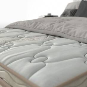 A primeira camada conta com conforto extra em Pillow Euro e matelassê preenchido com fibra siliconada e espuma D20 Cilíndrica. Seu revestimento em malha branca com detalhes na cor bege (AY) possui gramatura 220 gramas e finalização com bordado new max. O tecido em malha apresenta excelência em sua elasticidade e flexibilidade, o que o torna um material confortável e harmonioso no contato com a pele.