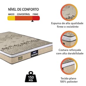 Revestimento interior: Espuma D33 de qualidade, que faz com que o colchão suporte até 150kg por pessoa, garantindo durabilidade e conforto