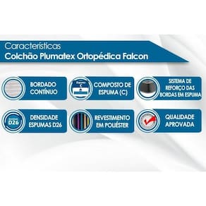 Imagens Meramente Ilustrativas. Não nos responsabilizamos pela montagem/instalação dos produtos. Todas as informações divulgadas são de responsabilidade exclusiva do fabricante/fornecedor. Forração Revestimento do Colchão: Malha Importada Nível de Firmeza do Colchão: Firme Nossa Avaliação do Colchão: Qualidade Boa Peso Máximo Suportado do Colchão: 120 kg Tempo de Garantia do Colchão: 12 meses Certificação de Qualidade do Colchão: Qualidade Aprovada Tecido de Revestimento da Faixa Lateral do Colchão: Decorativa Bordado do Revestimento do Colchão: Contínuo Tecido com Tratamento do Colchão: AntiÁcaro e AntiFungo Camadas Interna do Estofamento de Espuma do Colchão: Alta Qualidade Densidade da Espuma do Colchão: 26 Código universal de produto (GTIN): 7899076946267 Produto precisa de Montagem?: Sim, a montagem é simples mas sugerimos a contratação do nosso de montagem (para os CEPs em que o está disponível) ou de algum experiente de sua preferência Descrição do Tamanho: cm Estado de Origem: RJ País de origem: Peso Produto Com Embalagem (Kg): Material para Filtro: N/I Cor Mobly: N/I Condição do Item: Numeral: 0 Não se Aplica: N/A Não Possui: Não Linha/Modelo: Plumatex Cor Cnova: Blush Cor Meli: Ciano Categoria - Sub: Colchão de Espuma D26 Categoria - Pai: Colchão Comprimento Embalagem: Largura Embalagem: Altura Embalagem: Peso: Kg Kit: 0 Peso Real Kg: Peso Cubado: Volumes: 1 M3: Comprimento/Profundidade: 188 cm Largura: 138 cm Altura: 20 cm Tamanho Montado: x Comp/ x Alt: Comprimento/Profundidade Montado: Largura Montado: Altura Montado: MPN: 50350820021 Tamanho Cama Colchão: Casal Marca: Plumatex Fabricante: Plumatex Linha: Plumatex Marca: Não Informado
