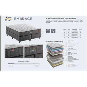 O Colchao Embrace Gel tem uma proposta inovadora de qualidade, refino e firmeza proporcionando os melhores sonhos. Conta com tecido produzido à partir de fibras de poliéster e fibras marromis, espuma soft foam gel infused que proporciona conforto refrescante regulando a temperatura, três zonas de suporte reforçando o terço central permitindo uma melhor adaptação do corpo, prolongando a durabilidade do produto. Abertura para Ventilação: Não Ambiente Principal: Quarto Antiácaro: Sim Antialérgico: Sim Antifungo: Sim Certificado: INMETRO Comprimento: 188 cm Cor: Cinza/Branco Cor do Produto: Cinza/Branco Itens Inclusos: 1 Colchão Necessita Montagem: Não Nível de Conforto: Firme Origem do Produto: Nacional Peso: 37.4 Pillow: Não possui Possui Certificado: Sim Possui Pillow: Não Precisa virar: Sim Recomendações de Uso, Manutenção e Limpeza: Fazer o giro quinzenal e manter em local arejado. Revestimento: Malha Tamanho: Casal Tipo do Colchão: Mola
