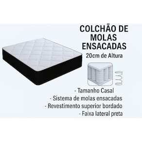 - Proteções: Antiácaro - Antialérgico - Antifungo - Antimofo;- Acabamento: Bordado em Matelassê;- Matéria prima: Poliéster/Bordado;- Mola: Ensacada;- Peso máximo recomendado: até 100kg (por pessoa) - Garantia: 3 meses;- Dimensões do produto (altura x largura x comprimento): 20x138x188cm;