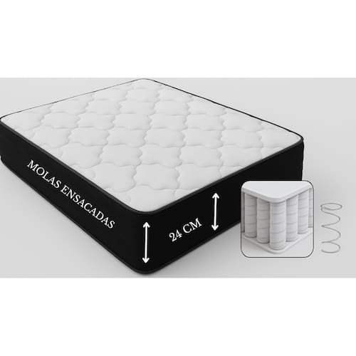 Com 24cm de altura, o colchão conta com revestimento superior bordado, garantindo um toque macio e acabamento sofisticado. Sua faixa lateral preta reforça a durabilidade e adiciona um visual moderno e elegante ao ambiente.