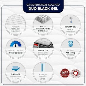 - Espuma em Gel, tecnologia que contribui para o alivio de pressão, facilita a circulação sanguínea e evita formigamento. Possui alta sensibilidade à temperatura proporcionando sensação de frescor e agradável conforto, redução da temperatura corporal até 33 vezes mais rápido.
