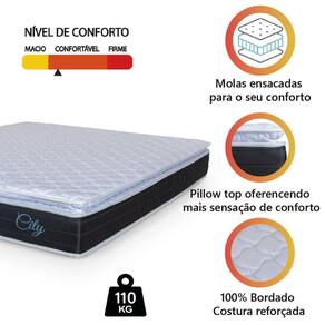 Colchão Casal Molas Ensacadas City Pillow Top 138x188x23cm Hellen Pret/branc Descubra o extremo conforto do Colchão City, projetado para garantir a qualidade do seu sono proporcionando uma experiência única de descanso! Conta com molas ensacadas de alta qualidade que trabalham em conjunto proporcionando resistência e aconchego na hora do descanso. Além de possuir pillow top que é uma camada extra de conforto proporciona uma experiência de sono inigualável. Invista na qualidade do seu sono e experimente garantia total de descanso e qualidade de vida! MEDIDAS: [ A ] = 23 cm [ L ] = 138 cm [ P ] = 188 cm PESO SUPORTADO: 110 kg por pessoa PESO: 23,21 kg Características MODELO: Colchão Casal Molas Ensacadas City Pillow Top 138x188x23cm MARCA: Hellen REVESTIMENTO SUPERIOR E LATERAL: Tecido em poliéster que permite melhor ventilação, proporcionando conforto e sensação agradável ao toque. REVESTIMENTO INTERIOR: Molejo estrutural em molas ensacadas individualmente, que permitem que o colchão suporte até 110kg por pessoa, oferecendo conforto e estabilidade durante o sono. REVESTIMENTO INFERIOR: Tecido antiderrapante PILLOW TOP: Sim, oferecendo ainda mais sensação de conforto ESPUMA: D26 POSSUI EPS: Sim ITENS INCLUSOS: 1 Colchão de 1,38m GARANTIA: 12 Meses pelo Fabricante