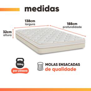 MEDIDAS: [ A ] = 32 cm [ L ] = 138 cm [ P ] = 188 cm PESO SUPORTADO: 130 kg por pessoa PESO: 34,2 kg MODELO: Colchão Casal Molas Ensacadas Memphis 138x188x32cm MARCA: CBP REVESTIMENTO SUPERIOR E LATERAL: Tecido Malha, que oferece maciez, durabilidade e um acabamento sofisticado REVESTIMENTO INTERNO: Estrutura de molas ensacadas individualmente, que suportam até 130kg por pessoa, garantindo conforto e estabilidade ao dormir ESPUMA: Camada de espuma D26 dentro dos padrões ABNT, de alta qualidade, que proporciona conforto na medida certa OBSERVAÇÃO: O colchão conta com uma base em EPS, um material resistente, leve e de alta durabilidade, que garante maior firmeza e prolonga a vida útil do colchão ITENS INCLUSOS: 1 Colchão Casal (138 cm) INTRUÇÕES E CUIDADOS: Utilizar em local seco e arejado, não dobrar ,fazer giro quinzenalmente no sentido pés/cabeceira GARANTIA DO COLCHÃO: 12 meses pelo fabricante