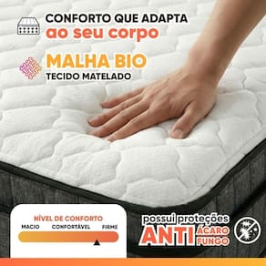 COLCHÃO CONTÉM: ANTI MOFO: prolonga a vida útil do colchão, preservando a integridade e a qualidade do tecido / ANTI ALÉRGICO: proporciona noites de sono mais tranquilas, saudáveis e livres de irritações / ANTI ÁCARO: mantém o ambiente de descanso mais puro, higiênico e agradável