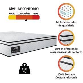REVESTIMENTO INTERIOR: Molas ensacadas que permitem que o colchão suporte até 120kg por pessoa, oferecendo conforto e estabilidade durante o sono