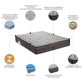 Além disso, o tampo do colchão, bordado em Matelassê, proporciona uma camada extra de conforto que torna cada momento uma experiência única. E para quem se preocupa com a saúde e o bem-estar, o revestimento em Viscopoli conta com tratamento antialérgico e antiácaro, garantindo um ambiente mais limpo e saudável. Invista no seu descanso e transforme o quarto de casal com o colchão queen. Afinal, um bom colchão é o primeiro passo para uma vida cheia de energia e disposição. Para completar, devido a sua estrutura, esse colchão de casal conta com o sistema no turn, ou seja, não há necessidade de vira-lo, basta relaxar e aproveitar.