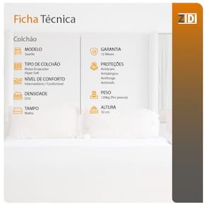 * CAMADAS DE ESPUMA INTERNA Espuma Densidade D33 - A densidade é a quantidade de matéria-prima utilizada para se fazer um colchão. Quanto maior a densidade, maior o suporte que esse colchão terá a pesos mais elevados. Hiper Soft - Espumas Hiper-macias- As espumas hiper-soft são caracterizadas por um toque inicial muito macio, baixa resistência à compressão. São normalmente fabricadas com densidades de 30 kg/m3 e como às viscoelásticas são usadas em aplicações de alto conforto, nas camadas superficiais de colchões