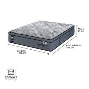 Modelo: Charlotte Nível de Conforto: Macio Suporte de peso: 240 quilos (120kg por pessoa) Molas: Molas Ensacadas Individualmente Pillow: Pillow Cloud Espuma: D33 e D28 Altura: 34cm Tecido: Tampo em Malha Margan