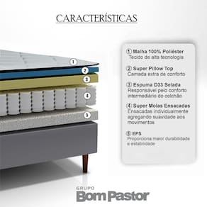 O Colchão King Molas Ensacadas Colorado 193x203x26 Bom Pastor oferece o máximo em conforto, espaço e durabilidade para quem não abre mão de uma noite de sono reparadora. Com sistema de molas ensacadas individualmente, garante suporte ideal ao corpo e absorção de movimentos, proporcionando tranquilidade mesmo com a movimentação do parceiro. Seu Pillow Top com espuma D33 selada entrega uma sensação de aconchego com firmeza, enquanto o EPS na base reforça a estrutura e a vida útil do colchão. Produzido com materiais de alta qualidade e vendido direto da fábrica, é a escolha perfeita para quem busca sofisticação e conforto no tamanho King.
