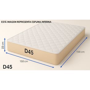 - Proteções: Antiácaro - Antialérgico - Antifungo - Antimofo;- Acabamento: Bordado em Matelassê;- Matéria prima: Espuma/Bordado;- Densidade: D45;- Peso máximo recomendado: até 100kg (por pessoa);- Garantia: 3 meses;- Dimensões do produto (altura x largura x comprimento) : 22x158x198cm;