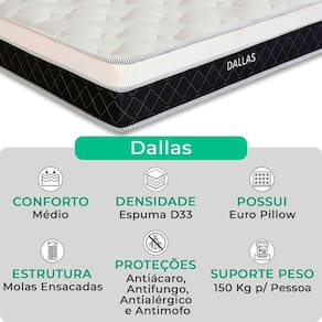 O Colchão Dallas foi criado para clientes exigentes que buscam o máximo de conforto e bem-estar. Desenvolvido com molas ensacadas e espuma D33, oferece o suporte ideal para a sua coluna, enquanto o Euro Pillow proporciona um toque extra de conforto e suavidade. Além disso, conta com a tecnologia EPS, garantindo maior durabilidade e resistência, com um excelente conforto térmico.