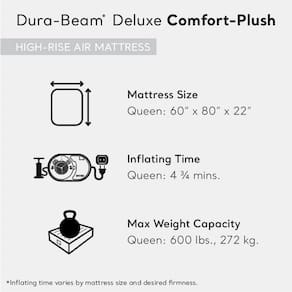 - BOMBA ELÉTRICA AC EMBUTIDA — Bomba elétrica embutida de alta potência (110-120 V) para facilitar inflação e deflação; os usuários podem configurar o colchão de ar de forma fácil e rápida quando precisa dela e depois esvazie-a (tempo aproximado de inflação de 4,75 minutos)