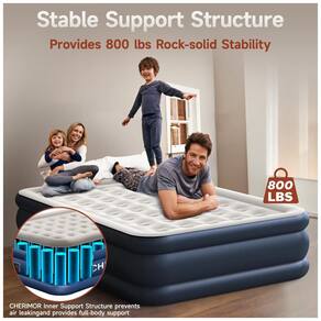 A solução de sono confortável de Cloreto de Polivinila. O colchão de ar queen da CHERIMOR de 203x152x48cm apresenta uma superfície superior feita de material aveludado macio e seguro para crianças. Além de agradável ao toque e respirável, é fácil de limpar, adequado para todos os tipos de dorminhocos. Com 40 câmaras, suporta até 362 kg, oferecendo conforto comparável aos colchões de molas de alta qualidade. Feito de PVC antipuncionamento 40% mais espesso, com processo de prensagem a quente de três camadas, possui fundo antiderrapante e silencioso.