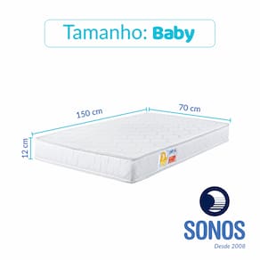 - Modelo: Home Baby - Dimensões: 70 x 150 x 12 cm (largura x comprimento x altura) - Espuma: D18 – Padrão ABNT - Revestimento: 100% poliéster - Estrutura: Dupla face - Suporte de peso: até 15 kg - Registro Inmetro: 004 779/2024 - Origem: Indústria Brasileira - Marca: Sonos