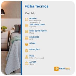 O Colchão Supreme D20 é produzido em espuma D20 possuindo tecnologia Double face (você pode girar e virar, com isso a parte utilizada passa a descansar no período que não é utilizada). Suportando até 50kg (por pessoa) proporcionando conforto firme, o que lhe confere firmeza suficiente para preservar sua coluna durante o sono sem comprometer seu conforto.