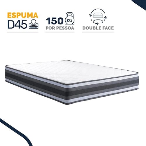 O sistema Double Face permite virar o colchão, aumentando a vida útil. O tampo em Malha melhora o conforto térmico e seu revestimento lateral conta com um tecido respirável(área 3D), o modelo suporta até 150kg por pessoa.
