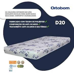Descubra o conforto e a qualidade do colchão solteiro com Espuma D20 da Ortobom. Com um design dupla face, este colchão oferece a versatilidade de ser utilizado dos dois lados, prolongando sua durabilidade. Revestido com tecido plano simples 100% poliéster, proporciona um toque suave e resistência superior. A lâmina de espuma convencional 100% poliuretano garante firmeza e conforto, adaptando-se perfeitamente ao formato do corpo para um sono reparador. Confie na qualidade e procedência da marca Ortobom, reconhecida pela excelência e tradição no mercado de colchões.
