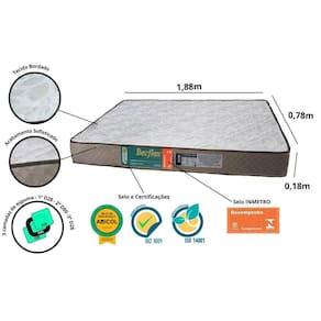 Certificado pelo Inmetro é produzido de acordo com as Normas da Associação Brasileira de Normas Técnicas (ABNT). A Becflex é certificada pela ISO 9001, certificação que garante a qualidade e padronização dos colchões, ISO 14001, que certifica a responsabilidade ambiental do processo produtivo, possui direito ao uso do SELO ABICOL (ASSOCIAÇÃO BRASILEIRA DA INDÚSTRIA DE COLCHÕES), comprovando a sua idoneidade. Também é uma empresa AMIGA DA CRIANÇA, associada à FUNDAÇÃO ABRINQ, e ainda possui o selo RECUPERA, o qual garante a reciclagem das embalagens dispostas no mercado, pela empresa. Obs: Este anúncio não acompanha a cama box, apenas o colchão.