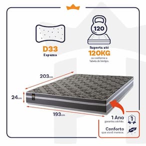 Feito com os mais nobres materiais em sua composição, ele conta com espuma D33. O colchão King House acomoda melhor o contorno do corpo, dispondo de forma correta quadris e ombros, expulsando as dores e problemas de coluna.