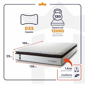 Feito com os mais nobres materiais em sua composição, ele conta com espuma D33 . O colchão King House acomoda melhor o contorno do corpo, dispondo de forma correta quadris e ombros, expulsando as dores e problemas de coluna.