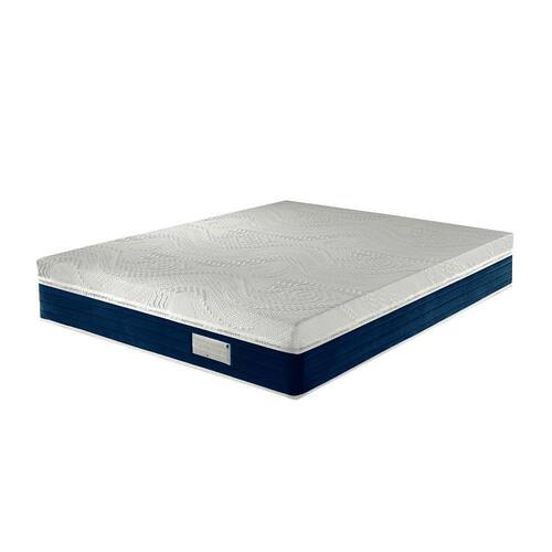Colchão possui tampo em malha 100% Poliéster Gramatura 440g/m , 7 cm espuma convencional densidade 33kg/m , certificada, fabricação própria, camada isolante (feltro) colado sobre molas ensacadas individualmente de 15cm, poliestireno Expandido de 8cm, Espuma convencional Densidade 20kg/m de 2cm ao fundo tecido plano 100% Poliéster Gramatura 97g/m, e na sua lateral com tecido Veludo Azul 100% Poliéster com toque macio dando mais conforto.