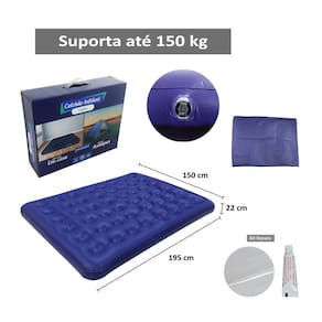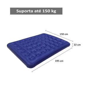 Colchão Inflável Casal Multiuso ImporienteO Colchão Inflável Casal Imporiente é produzido em PVC resistente em toda a sua estrutura, conta com um revestimento aveludado na parte superior que torna sua superfície extremamente confortável e facilita a aderência do lençol ou dispensa sua utilização. Além disso, suas ondulações proporcionam o ajuste do corpo, oferecendo um descanso agradável e adequado para diversas situações.O colchão multiuso casal é perfeito para servir como cama extra para receber suas visitas, acomodar as crianças para brincarem, assistir seus filmes favoritos em qualquer lugar da casa, utilizar em acampamentos ou onde você precisar!Principais Características:- Revestimento Aveludado com Ondulações- Compacto para Guardar- Proteção contra vazamento- Fácil de Encher e Esvaziar- Cor: Predominante Azul- Capacidade: 2 pessoas- Peso Suportado: 150 kg Aprox.Especificações Técnicas:- Conteúdo da Embalagem: 1 Colchão Inflável Casal + Manual de Instruções- Dimensão Aberta: (LxCxH) 22,0 x 150,0 x 1,95 cm Aprox.- Composição/Material: PVC- Referência do Fabricante: IM46278- Código EAN: 7899790965346- Marca: ImporienteLeia atentamente o manual antes de inflar o colchão