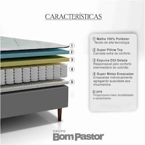 Estrutura em molas ensacadas individualmente e borda lateral em espuma de alto resiliência.