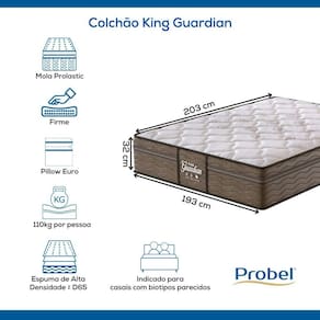 A espuma do Colchão King Guardian foi desenvolvida com a Tecnologia ProMax Probel, que passa por rigorosos testes de qualidade em laboratório e recebe tratamento antiácaro e antifungo.
