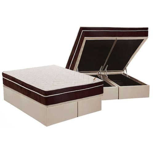 BENEFÍCIOS EXTERNOS CAMA BOX Forração de Revestimento da Cama Box - Acabamento em Poliéster Tipo de bordado do tecido da lateral da Cama Box - Matelassê Bordado Características Gerais da Cama Box - Articulação em Aço com Sistema Basculante - Amortecedores de Articulação