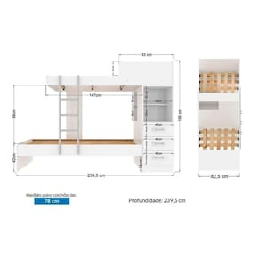 Dimensões(Cm): Comprimento(Profundidade): 239,5cm x Largura: 92,5cm x Altura: 169cm Material de Estrutura - MDF/MDP - Estrutura 100% MDP Tipo de Pintura - Ultravioleta - Texturizada Tipo de Acabamento da Pintura - Semi Brilho Tamanho da Cama - Solteiro Diferenciais das Camas - Proteção Lateral - Escada Metálica - Escada Frontal Quantidade de Gavetas - 3 Tipo dos Pés - Aço Quantidade de Prateleiras - 1 Prateleira Quantidade de Nichos - 1 Nicho Montagem do Produto - Desmontável - c/ Opções de Montagem Certificação de Qualidade - Qualidade Aprovada - ISO 9001 - ISO 14001 Garantia - 3 meses