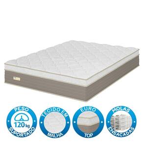 Características: Peso suportado 120kg Molas ensacadas Densidade D-26 Revestimento tampo malhas Revestimento lateral poliéster Possui EPS One face -não permite virar o colchão- Possui pilow: Euro top Selo inmetro: 007069/2024 OCP: 0166