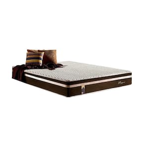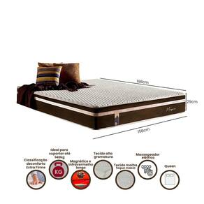 Colchão possui tampo em malha 84% Poliéster 16% Viscose Gramatura 778g/m2, Perfilado High Tech que possui a cada 12cm uma pastilha de magnético e uma de Infra vermelho, 10 cm espuma convencional densidade 33kg/m , certificada, fabricação própria, 8 pontos de massagem distribuídas 4 para cada lado , poliestireno Expandido de 8cm, Espuma convencional Densidade 20kg/m de cm ao fundo tecido plano 100% Poliéster Gramatura 97g/m, e na sua lateral com tecido Veludo Marrom 100% Poliéster com toque macio dando mais conforto.