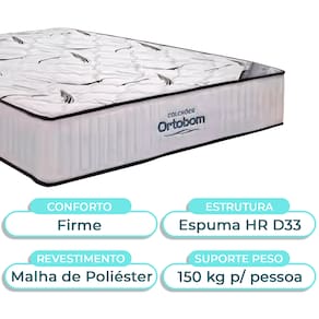 O Colchão High Foam Espuma HR D33 Ortobom é desenvolvido com tecido de malha de poliéster de eucalipto, tratado com aloe vera, óleo de jojoba e vitamina E — proporcionando um toque macio, refrescante e um verdadeiro tratamento de beleza enquanto você dorme.Seu interior é composto por espuma de alta tecnologia HR (High Resilience), que oferece maior elasticidade, suporte e conforto ao corpo, adaptando-se perfeitamente às suas curvas. Com densidade D33, o High Foam garante resistência, durabilidade e um sono mais estável e revigorante.Ficha Técnica Colchão:Modelo: High FoamMarca: OrtobomTamanho: QueenTecido: Tecido Eucalipto em Malha de PoliésterLargura: 158cmComprimento: 198cmAltura: 28cmSuporte de Peso: 150KgGarantia: 12 MesesTecnologia No Turn (não necessita ser virado)Atenção:Antes da compra certifique-se de que o produto passa por elevadores, portas e corredores.As transportadoras não realizam entregas por escadas ou içamentos.Caso o item não caiba no elevador, a entrega será considerada concluída no térreo do prédio.A cor e tonalidade do produto pode variar de acordo com o dispositivo que o usuário está acessando.