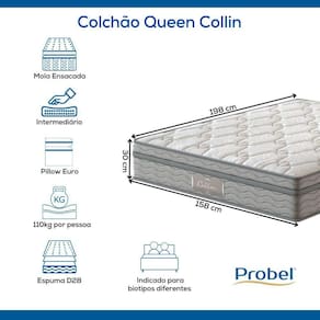 Experimente o equilíbrio perfeito de maciez e firmeza com o sistema de estabilidade individual incomparável.Nível de Firmeza: IntermediárioO equilíbrio perfeito entre macio e firme.Desfrute do equilíbrio perfeito entre maciez e firmeza com o Colchão Queen Collin. Você experimentará um modelo de firmeza intermediária que proporciona um conforto excepcional, moldando-se aos pontos de maior pressão do seu corpo. Este colchão é a escolha ideal para quem busca um suporte alinhado à coluna, mantendo o máximo aconchego.Espumas ProMax ProbelA espuma do Colchão Queen Collin foi desenvolvida com a Tecnologia ProMax Probel, que passa por rigorosos testes de qualidade em laboratório e recebe tratamento antiácaro e antifungo.Com alto padrão de qualidade, a manta de espumas com densidade D28 do Colchão Queen Collin contribui para uma sustentação intermediária, atendendo tanto aqueles que estão acostumados com a sensação firme quanto os que preferem uma superfície mais macia.Descubra a perfeita harmonia entre conforto, sustentação e durabilidade com o Colchão Queen Collin. Aproveite noites de sono revigorantes e acorde renovado todos os dias.Molas Ensacadas ProbelDescubra o Conforto Superior das Molas Ensacadas para Noites de Sono Perfeitas!Viva o Luxo do Molejo Mais Avançado do MercadoAs Molas Ensacadas são a escolha definitiva para aqueles que buscam o máximo conforto e durabilidade em um colchão. Com design revolucionário, cada mola é cuidadosamente fabricada em aço carbono temperado, tornando-as incrivelmente resistentes.Quando se compartilha o colchão com um parceiro que possui um biotipo diferente, as Molas Ensacadas Probel são a escolha perfeita! Mesmo quando um parceiro se movimenta durante a noite, o outro não sentirá absolutamente nada, graças ao avançado sistema de isolamento de movimento oferecido pelas molas ensacadas individualmente. Isso significa que ambos os parceiros podem desfrutar de noites de sono ininterruptas e revigorantes, independente dos movimentos de um ou outro.Faça a escolha sensata para um sono de qualidade a dois, escolha as Molas Ensacadas Probel e descubra o conforto e a tranquilidade de noites ininterruptas com seu parceiro.Noites Tranquilas para Casais com Biotipos DiferentesImagine-se deitado em um colchão que se ajusta de maneira suave e personalizada às curvas do seu corpo, proporcionando um suporte ideal exatamente onde você precisa. Com as Molas Ensacadas, você experimentará o conforto que só pode ser encontrado em um colchão que foi criado com a sua qualidade de sono em mente. Eleve o nível da sua noite de sono e descubra o que é verdadeiramente descansar.Pillow EuroA definição de estilo e aconchego.A nossa linha de colchões Collin utiliza o Pillow Euro que funciona como um abraço de espuma extra com um toque de estilo moderno. Ele apresenta uma camada adicional de conforto com uma divisão suave, realçada por um fitin costurado ao longo de toda a lateral do colchão. Combinando conforto e design, o Pillow Euro é a escolha perfeita para um sono com estilo e aconchego.Base em EPS ProbelO poliestireno expandido, também conhecido como EPS, é um material utilizado como base de colchões e tem várias vantagens. Ele oferece uma maior vida útil e resistência à deformação na estrutura do colchão, o que é fundamental para manter a qualidade do sono ao longo do tempo. O EPS é mais resistente do que a madeira e a espuma, tornando-o uma escolha durável. Outra grande vantagem é que o EPS é 100% reciclável, o que o torna uma opção mais amigável ao meio ambiente. Além disso, ele não tem cheiro, não absorve umidade do ambiente e do corpo, o que ajuda a manter o colchão livre de mofo e bactérias.Vantagens da Base em EPS:- Não tem cheiro- Não absorve umidade do ambiente e do corpo- Não mofa e nem embolora- É 100% reciclável- Excelente custo benefício, pois tem valor bem menor que a base de espuma.Side Security ProbelO uso do perímetro de proteção em espuma D28 em todas as laterais dos colchões de mola é um elemento-chave para melhorar a experiência de sono. Esta inovação desenvolvida pela Probel, não apenas amplia a área de conforto, mas também eleva o nível de acabamento, proporcionando suporte aprimorado e estabilidade excepcional nas extremidades do colchão. Além disso, essa camada de espuma D28 contribui significativamente para a durabilidade e a vida útil do colchão, assegurando que você desfrute de noites de sono tranquilas por muitos anos.Veja os benefícios do Side Security Probel:- Aumenta o espaço de conforto;- Melhora o acabamento do colchão;- Proporciona maior suporte e estabilidade nas extremidades.Não comprometa o conforto e a postura - escolha o colchão que se adapta a você.