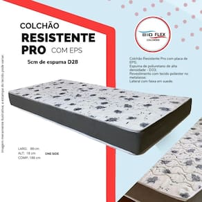 Colchão Resistente Pro Solteiro 18x188x88 Bio Flex O Colchão Resistente Pro Solteiro 18x188x88 Bio Flex é a escolha ideal para quem busca durabilidade e um excelente custo-benefício. Projetado com foco na resistência e no suporte adequado, este modelo de solteiro oferece a firmeza necessária para garantir o alinhamento da coluna durante o sono, contribuindo para noites de descanso reparadoras. Sua construção pela renomada marca Bio Flex utiliza materiais de qualidade que asseguram a longevidade do produto, como a espuma de alta densidade que compõe a Linha Resistente Pro. O revestimento é pensado para ser agradável ao toque e conta com tratamento antiácaro e antimofo, promovendo um ambiente de sono mais higiênico e saudável. Optar pelo Colchão Resistente Pro Solteiro 18x188x88 Bio Flex é investir em um descanso de qualidade sem abrir mão da economia. Este colchão se adapta perfeitamente a quartos de solteiro, beliches ou camas auxiliares, oferecendo um suporte firme e confiável para o dia a dia. Com a combinação de conforto e resistência, a Bio Flex reafirma seu compromisso em levar soluções eficazes para o seu bem-estar e a sua qualidade de vida.\nMEDIDAS\nAltura 18 cm\nComprimento 188 cm\nLargura 88 cm\nCARACTERÍSTICAS\nFabricante Bio Flex\nModelo Colchão Resistente Pro Solteiro\nGarantia 3 meses\nTipo de produto Colchão de Solteiro\nEstrutura Placa de EPS, Espuma de Poliuretano de Alta Densidade, Revestimento com Tecido Poliéster no Metalasse, Lateral com Faixa em Suede\nDensidade D28 / D33\nTecido com Tratamento Antiácaro e Antimofo\nINFORMAÇÕES IMPORTANTES\nObjetos decorativos que porventura apareçam na foto, não acompanham o produto. Não nos responsabilizamos pela montagem/instalação dos produtos.\nMontagens, desmontagens e instalações são responsabilidades do cliente. Indicamos que contrate uma empresa de montagem ou um montador de sua confiança.\nAlém disso, favor verificar se os pés e acessórios estão dentro do forro inferior do produto. Em suma, todas as informações divulgadas sobre o produto são de responsabilidade do Fabricante.\nAs cores do produto podem variar de acordo com o seu monitor, a iluminação do ambiente em que você está e até mesmo a sua percepção visual. Além da cor, pequenos detalhes e acabamentos podem não ficar evidentes na foto, por isso as imagens são meramente ilustrativas.
