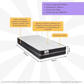 Tecido: Jacquard/Poliéster Acabamento: Debrum Com Pillow: Não Duplo Pillow: Não Conforto: Firme Peso Suportado: 150kg Hipoalergênico: Não Antiácaros: Não Eco-friendly: Sim Sistema: Turn-free (não é necessário virar o colchão, apenas girá-lo a cada 15 dias). Selo INMETRO: 09977-001-03/2023 Fabricante: Inducol