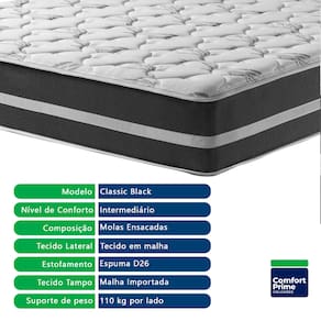 Com um suporte de peso de até 110 kg por lado, o Colchão Classic Black foi projetado para atender às mais diversas necessidades, proporcionando a sustentação perfeita sem abrir mão do conforto. Seja você alguém que prefere uma superfície mais firme ou que busca a maciez ideal para relaxar após um longo dia, este colchão entrega tudo o que você espera de um produto premium.