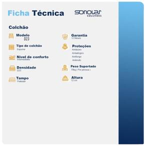 Experimente noites de sono confortáveis com o Colchão Solteiro D23 Sonolar Pacífico. Fabricado com espuma D23, oferece suporte adequado ao corpo, conforto intermediário e suporta até 70 kg por pessoa.