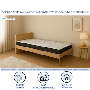 Colchão Solteiro Espuma D20 - 88x188x12cm Este colchão solteiro com espuma de densidade D20 é uma solução prática e econômica. Ideal para camas auxiliares, quartos de crianças ou para receber hóspedes.Características Técnicas e Uso:Densidade D20: Espuma de poliuretano com densidade adequada para suportar até 50kg de peso. Altura : Possui 12 cm de altura, medida ideal para ser utilizado em Bicamas e camas auxiliares.Tamanho Padrão: Medidas de 88 cm de largura por 188 cm de comprimento.Indicação: Uso infantil, camas de apoio e hóspedes.