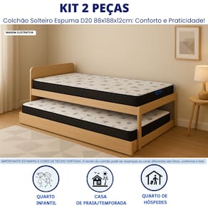 Kit 2 Colchões Solteiro Espuma D20 - 88x188x12cm Este colchão solteiro com espuma de densidade D20 é uma solução prática e econômica. Ideal para camas auxiliares, quartos de crianças ou para receber hóspedes.Características Técnicas e Uso:Densidade D20: Espuma de poliuretano com densidade adequada para suportar até 50kg de peso. Altura : Possui 12 cm de altura, medida ideal para ser utilizado em Bicamas e camas auxiliares.Tamanho Padrão: Medidas de 88 cm de largura por 188 cm de comprimento.Indicação: Uso infantil, camas de apoio e hóspedes. Ean: 7892407318467